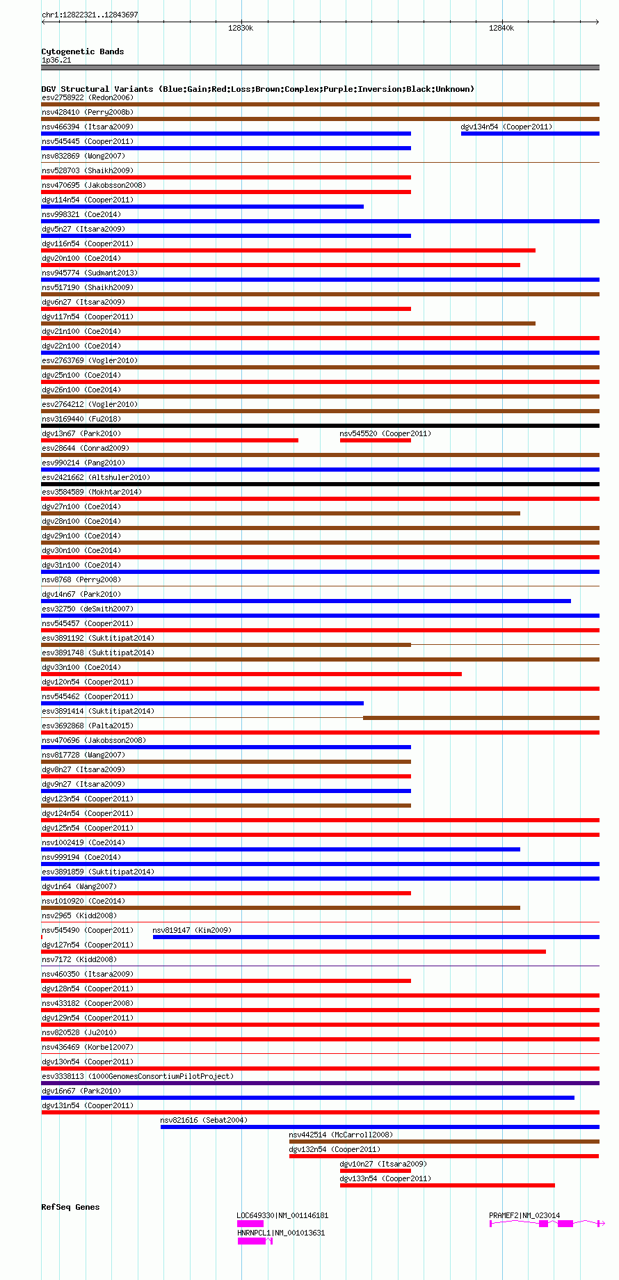 Variant DetailsVariant: nsv545512| Internal ID | 16332921 | | Landmark | | | Location Information | | | Cytoband | 1p36.21 | | Allele length | | Assembly | Allele length | | hg38 | 21375 | | hg19 | 21377 | | hg18 | 21377 |