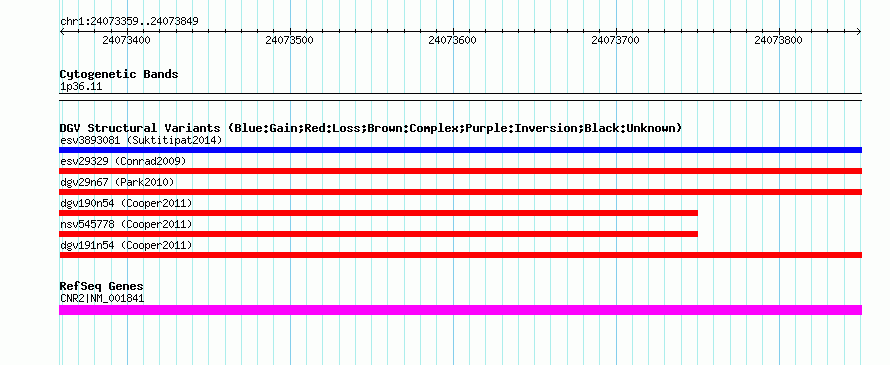 | | Variant Type | CNV loss | | Copy Number | | | Allele State | | | Allele Origin | | | Probe Count | | | Validation Flag | | | Merged Status | M | | Merged Variants | dgv191n54 | | Supporting Variants | nssv711337, nssv711336 | | Samples | | | Known Genes | CNR2 | | Method | SNP array | | Analysis | Illumina SNP array copy number analysis | | Platform | Not reported | | Comments | | | Reference | Cooper_et_al_2011 | | Pubmed ID | 21841781 | | Accession Number(s) | nsv545779