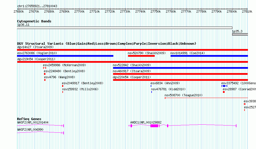 | Variant Type | CNV loss | Copy Number | | Allele State | | Allele Origin | | Probe Count | | Validation Flag | | Merged Status | M | Merged Variants | dgv219n54 | Supporting Variants | nssv712045 | Samples | | Known Genes | AHDC1, WASF2 | Method | SNP array | Analysis | Illumina SNP array copy number analysis | Platform | Not reported | Comments | | Reference | Cooper_et_al_2011 | Pubmed ID | 21841781 | Accession Number(s) | nsv545910