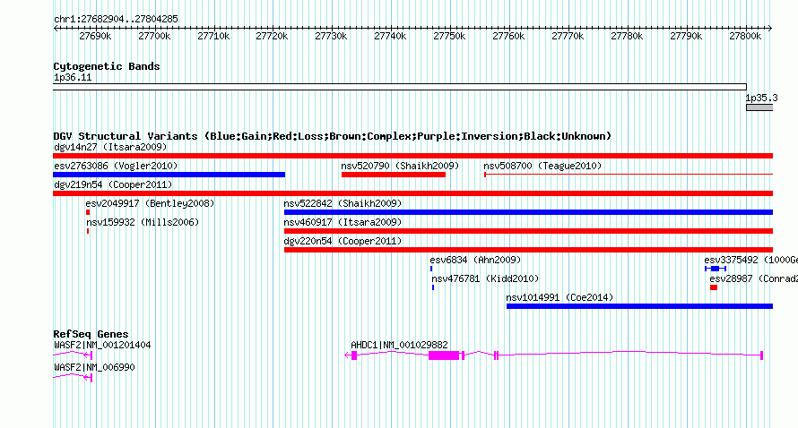 | Variant Type | CNV loss | Copy Number | | Allele State | | Allele Origin | | Probe Count | | Validation Flag | | Merged Status | M | Merged Variants | dgv219n54 | Supporting Variants | nssv1173802 | Samples | HGDP00850 | Known Genes | AHDC1, WASF2 | Method | SNP array | Analysis | Illumina SNP array copy number analysis | Platform | Not reported | Comments | | Reference | Cooper_et_al_2011 | Pubmed ID | 21841781 | Accession Number(s) | nsv545911