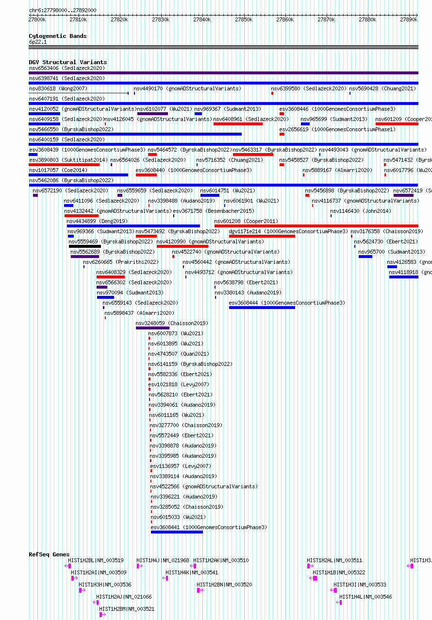| | Variant Type | CNV duplication | | Copy Number | | | Allele State | | | Allele Origin | | | Probe Count | | | Validation Flag | | | Merged Status | M | | Merged Variants | | | Supporting Variants | nssv16980886 | | Samples | | | Known Genes | HIST1H1B, HIST1H2AI, HIST1H2AJ, HIST1H2AK, HIST1H2AL, HIST1H2BL, HIST1H2BM, HIST1H2BN, HIST1H3H, HIST1H3I, HIST1H3J, HIST1H4J, HIST1H4K, HIST1H4L | | Method | Sequencing | | Analysis | | | Platform | | | Comments | | | Reference | Byrska_Bishop_et_al_2022 | | Pubmed ID | 36055201 | | Accession Number(s) | nsv5462086
