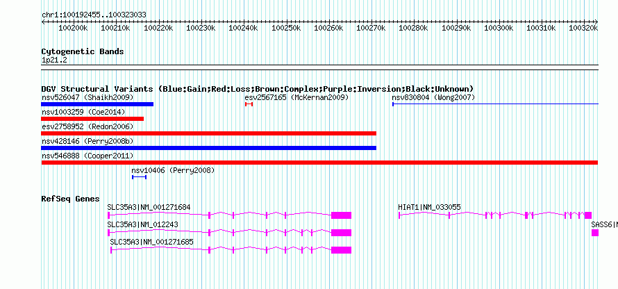 Variant DetailsVariant: nsv546888| Internal ID | 16334297 | | Landmark | | | Location Information | | | Cytoband | 1p21.2 | | Allele length | | Assembly | Allele length | | hg38 | 130579 | | hg19 | 130579 | | hg18 | 130579 |