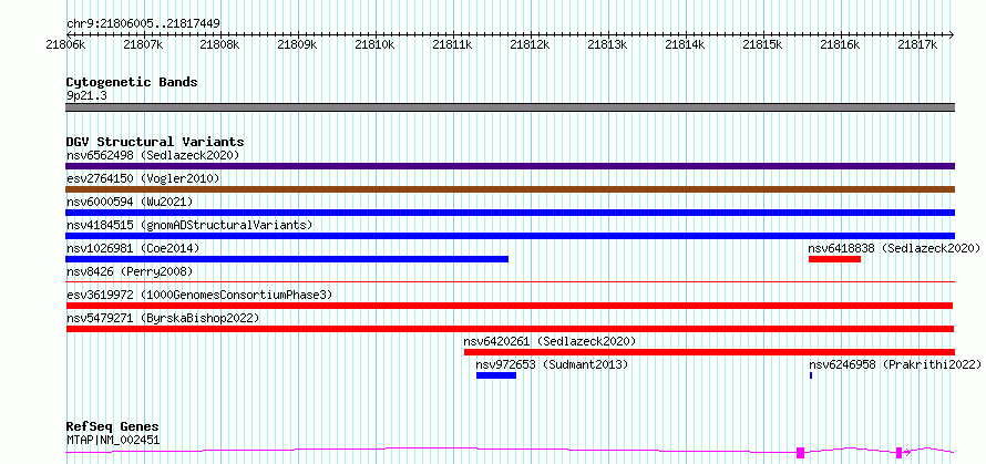 Variant DetailsVariant: nsv5479271| Internal ID | 256799 | | Landmark | | | Location Information | | | Cytoband | 9p21.3 | | Allele length | | Assembly | Allele length | | hg38 | 11445 | | hg19 | 11445 |