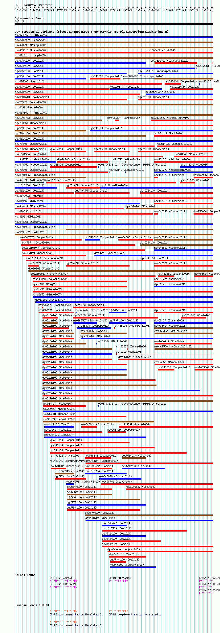 Variant DetailsVariant: nsv548765| Internal ID | 16336174 | | Landmark | | | Location Information | | | Cytoband | 1q31.3 | | Allele length | | Assembly | Allele length | | hg38 | 149597 | | hg19 | 149597 | | hg18 | 149597 |