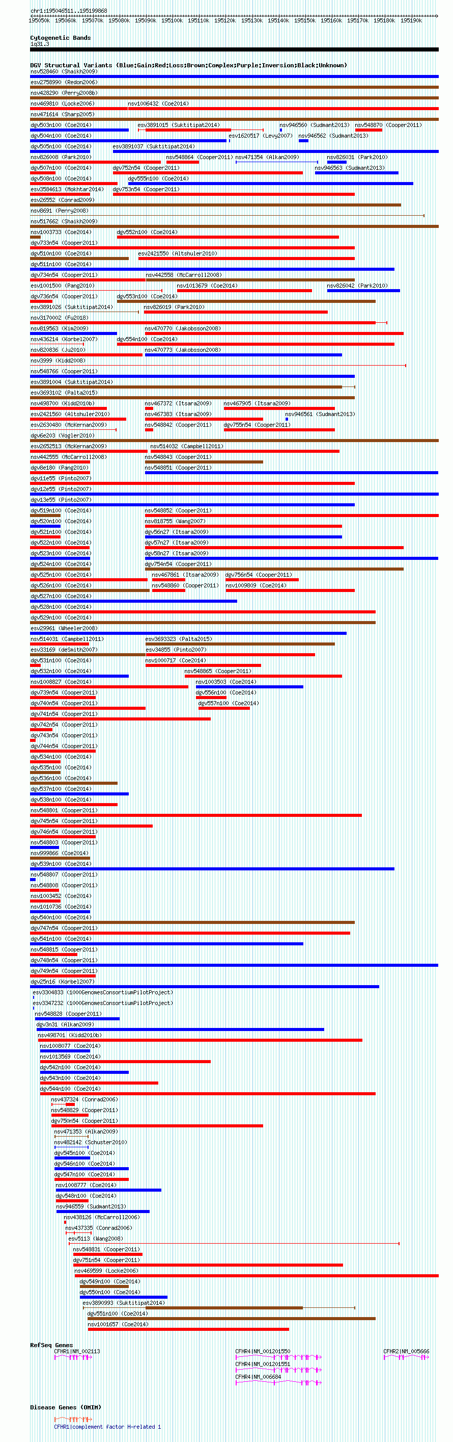 | | Variant Type | CNV gain | | Copy Number | | | Allele State | | | Allele Origin | | | Probe Count | | | Validation Flag | | | Merged Status | M | | Merged Variants | dgv748n54 | | Supporting Variants | nssv734043 | | Samples | | | Known Genes | CFHR1, CFHR2, CFHR4 | | Method | SNP array | | Analysis | Illumina SNP array copy number analysis | | Platform | Not reported | | Comments | | | Reference | Cooper_et_al_2011 | | Pubmed ID | 21841781 | | Accession Number(s) | nsv548826