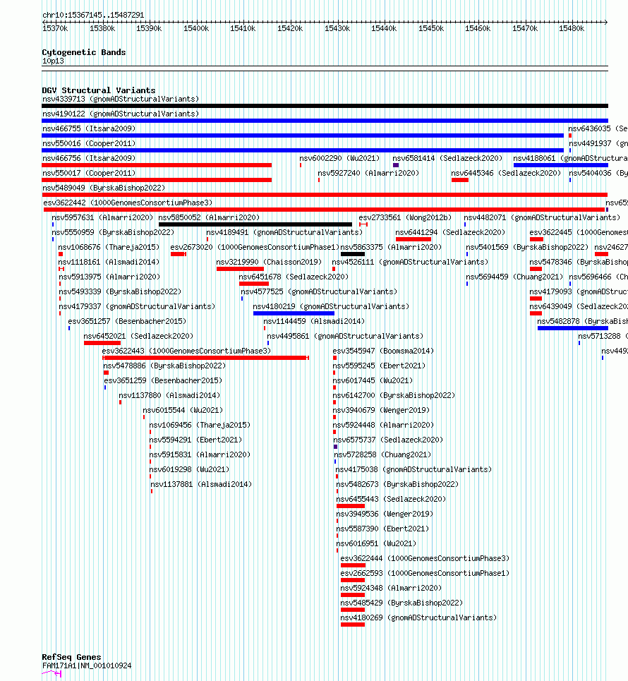 Variant DetailsVariant: nsv5489049| Internal ID | 266340 | | Landmark | | | Location Information | | | Cytoband | 10p13 | | Allele length | | Assembly | Allele length | | hg38 | 120147 | | hg19 | 120147 |