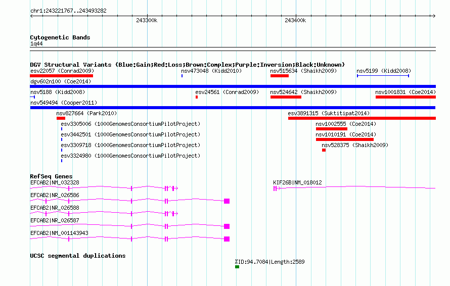 | | Variant Type | CNV gain | | Copy Number | | | Allele State | | | Allele Origin | | | Probe Count | | | Validation Flag | | | Merged Status | M | | Merged Variants | | | Supporting Variants | nssv739420 | | Samples | | | Known Genes | EFCAB2, KIF26B | | Method | SNP array | | Analysis | Illumina SNP array copy number analysis | | Platform | Not reported | | Comments | | | Reference | Cooper_et_al_2011 | | Pubmed ID | 21841781 | | Accession Number(s) | nsv549494