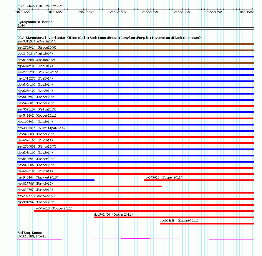 Variant DetailsVariant: nsv549607| Internal ID | 16337016 | | Landmark | | | Location Information | | | Cytoband | 1q44 | | Allele length | | Assembly | Allele length | | hg38 | 739 | | hg19 | 739 | | hg18 | 739 |