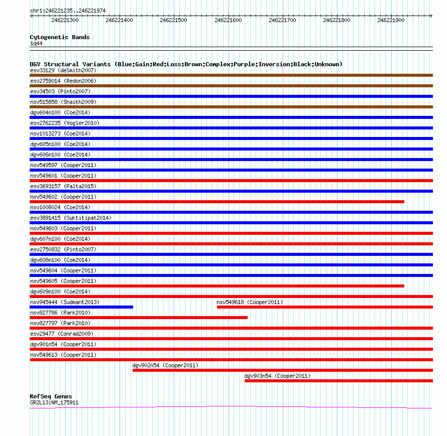 Variant DetailsVariant: nsv549611| Internal ID | 16337020 | | Landmark | | | Location Information | | | Cytoband | 1q44 | | Allele length | | Assembly | Allele length | | hg38 | 740 | | hg19 | 740 | | hg18 | 740 |