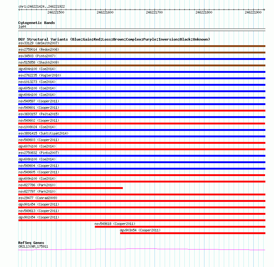 Variant DetailsVariant: nsv549614| Internal ID | 16337023 | | Landmark | | | Location Information | | | Cytoband | 1q44 | | Allele length | | Assembly | Allele length | | hg38 | 499 | | hg19 | 499 | | hg18 | 499 |