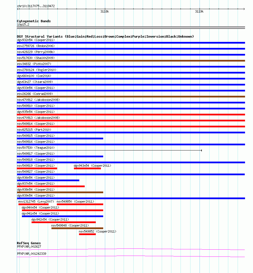 Variant DetailsVariant: nsv549827| Internal ID | 15990550 | | Landmark | | | Location Information | | | Cytoband | 10p15.2 | | Allele length | | Assembly | Allele length | | hg38 | 2398 | | hg19 | 2398 | | hg18 | 2398 |