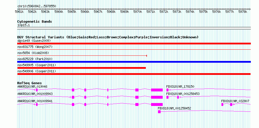Variant DetailsVariant: nsv549906| Internal ID | 16337315 | | Landmark | | | Location Information | | | Cytoband | 10p15.1 | | Allele length | | Assembly | Allele length | | hg38 | 17709 | | hg19 | 17709 | | hg18 | 17709 |