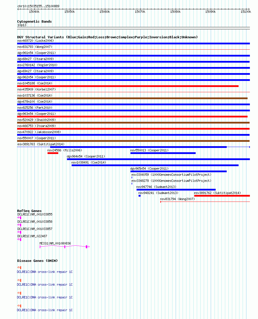 | | Variant Type | CNV gain | | Copy Number | | | Allele State | | | Allele Origin | | | Probe Count | | | Validation Flag | | | Merged Status | M | | Merged Variants | dgv962n54 | | Supporting Variants | nssv744093, nssv744094 | | Samples | | | Known Genes | DCLRE1C, MEIG1 | | Method | SNP array | | Analysis | Illumina SNP array copy number analysis | | Platform | Not reported | | Comments | | | Reference | Cooper_et_al_2011 | | Pubmed ID | 21841781 | | Accession Number(s) | nsv550010