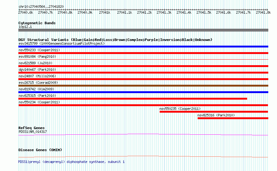 | | Variant Type | CNV loss | | Copy Number | | | Allele State | | | Allele Origin | | | Probe Count | | | Validation Flag | | | Merged Status | M | | Merged Variants | | | Supporting Variants | nssv744766, nssv744784, nssv744768, nssv744758, nssv744746, nssv744765, nssv744761, nssv744760, nssv744781, nssv744771, nssv744749, nssv744751, nssv744780, nssv744782, nssv744776, nssv744767, nssv744763, nssv744762, nssv744747, nssv744745, nssv744753, nssv744772, nssv744769, nssv744764, nssv744748, nssv744773, nssv744759, nssv744778, nssv744779, nssv744744, nssv744775, nssv744774, nssv744750, nssv744752, nssv744756, nssv744783, nssv744770, nssv744757, nssv744777, nssv744754, nssv744755 | | Samples | | | Known Genes | PDSS1 | | Method | SNP array | | Analysis | Illumina SNP array copy number analysis | | Platform | Not reported | | Comments | | | Reference | Cooper_et_al_2011 | | Pubmed ID | 21841781 | | Accession Number(s) | nsv550234