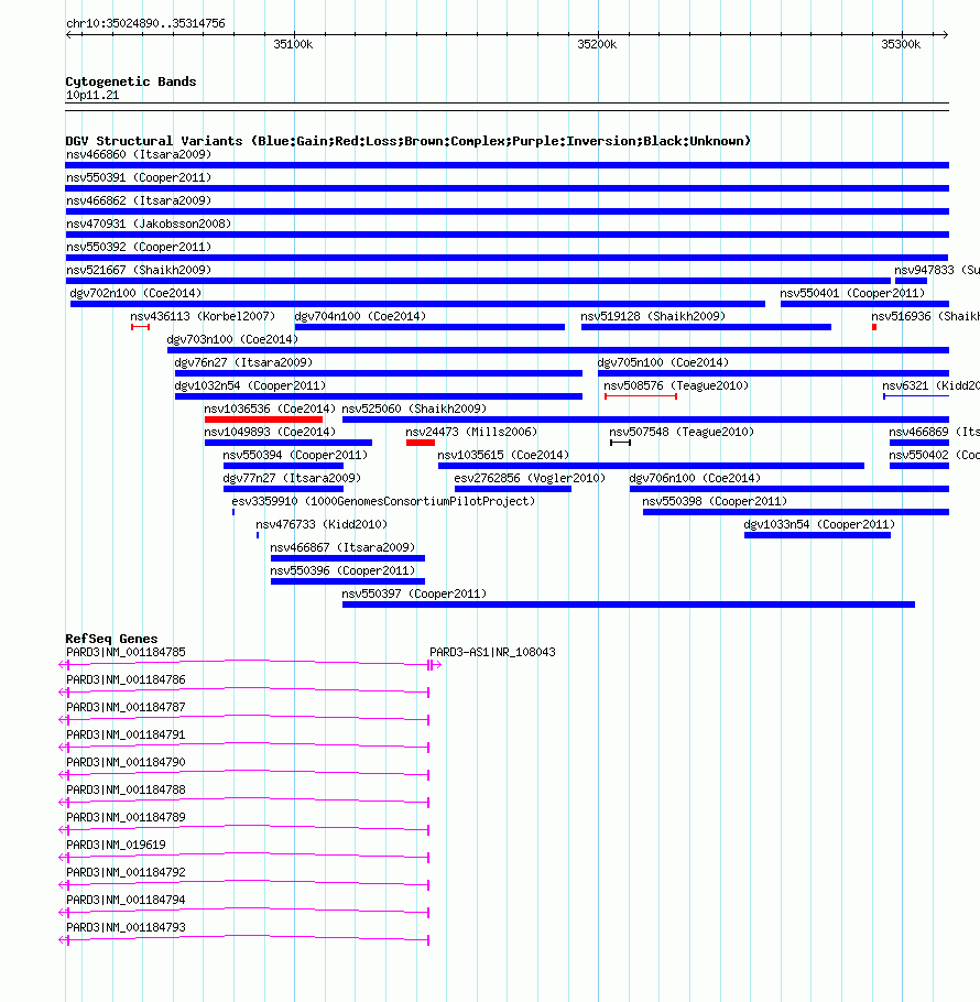 | | Variant Type | CNV gain | | Copy Number | | | Allele State | | | Allele Origin | | | Probe Count | | | Validation Flag | | | Merged Status | M | | Merged Variants | | | Supporting Variants | nssv1174975 | | Samples | HGDP00929 | | Known Genes | PARD3, PARD3-AS1 | | Method | SNP array | | Analysis | Illumina SNP array copy number analysis | | Platform | Not reported | | Comments | | | Reference | Cooper_et_al_2011 | | Pubmed ID | 21841781 | | Accession Number(s) | nsv550392
