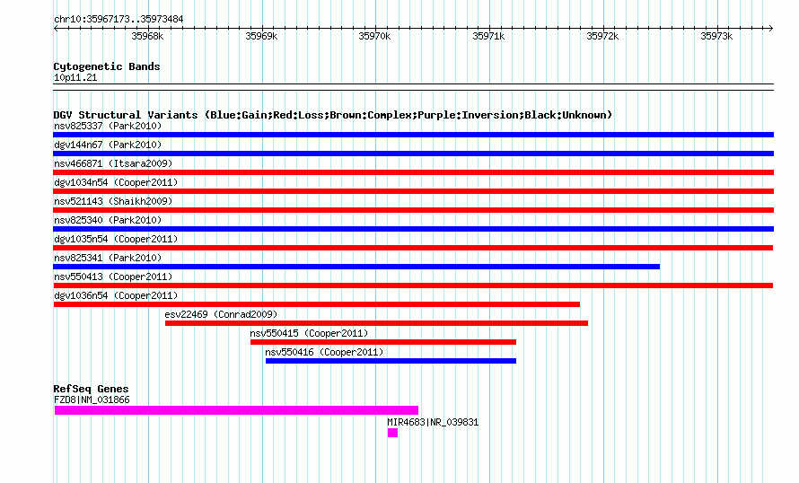 | Variant Type | CNV loss | Copy Number | | Allele State | | Allele Origin | | Probe Count | | Validation Flag | | Merged Status | M | Merged Variants | | Supporting Variants | nssv746849 | Samples | | Known Genes | FZD8, MIR4683 | Method | SNP array | Analysis | Illumina SNP array copy number analysis | Platform | Not reported | Comments | | Reference | Cooper_et_al_2011 | Pubmed ID | 21841781 | Accession Number(s) | nsv550413