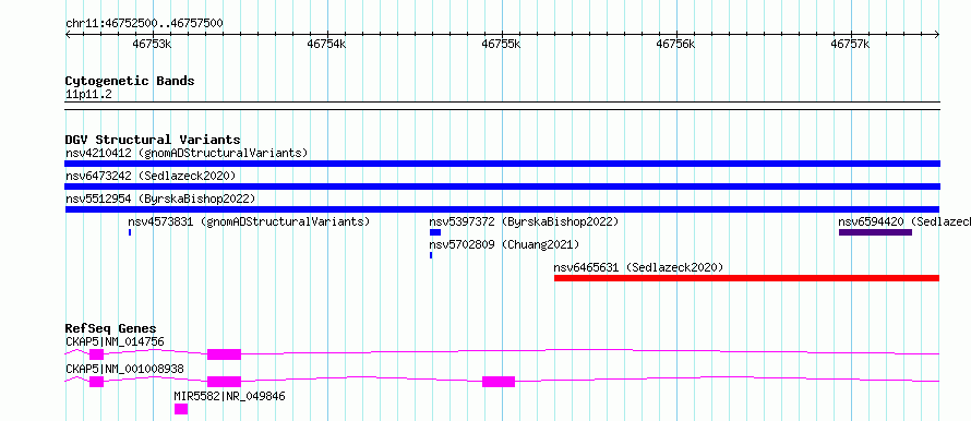 Variant DetailsVariant: nsv5512954| Internal ID | 289494 | | Landmark | | | Location Information | | | Cytoband | 11p11.2 | | Allele length | | Assembly | Allele length | | hg38 | 5001 | | hg19 | 5001 |