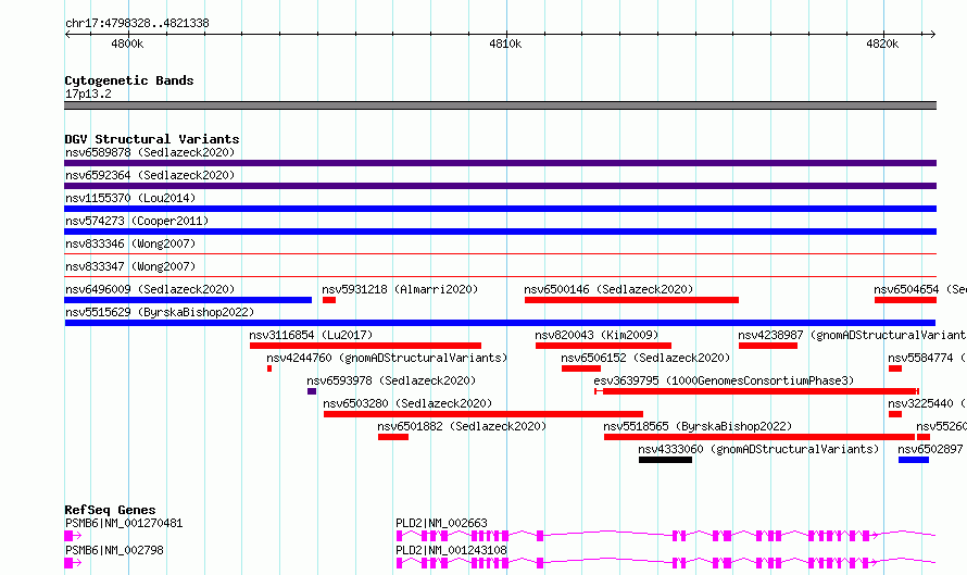 Variant DetailsVariant: nsv5515629| Internal ID | 292110 | | Landmark | | | Location Information | | | Cytoband | 17p13.2 | | Allele length | | Assembly | Allele length | | hg38 | 23011 | | hg19 | 23011 |