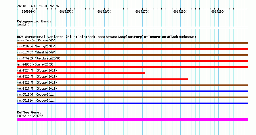 Variant DetailsVariant: nsv551809| Internal ID | 16339218 | | Landmark | | | Location Information | | | Cytoband | 10q23.2 | | Allele length | | Assembly | Allele length | | hg38 | 607 | | hg19 | 607 | | hg18 | 607 |