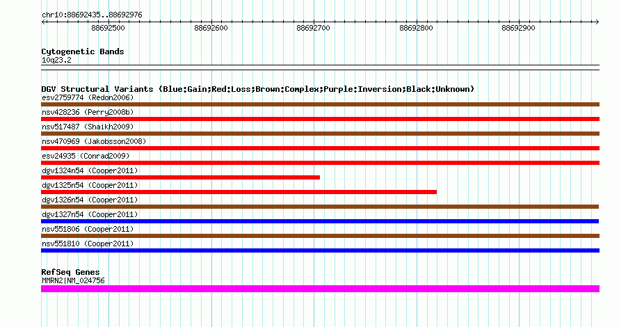 | | Variant Type | CNV gain+loss | | Copy Number | | | Allele State | | | Allele Origin | | | Probe Count | | | Validation Flag | | | Merged Status | M | | Merged Variants | dgv1326n54 | | Supporting Variants | nssv752259, nssv752260 | | Samples | | | Known Genes | MMRN2 | | Method | SNP array | | Analysis | Illumina SNP array copy number analysis | | Platform | Not reported | | Comments | | | Reference | Cooper_et_al_2011 | | Pubmed ID | 21841781 | | Accession Number(s) | nsv551811