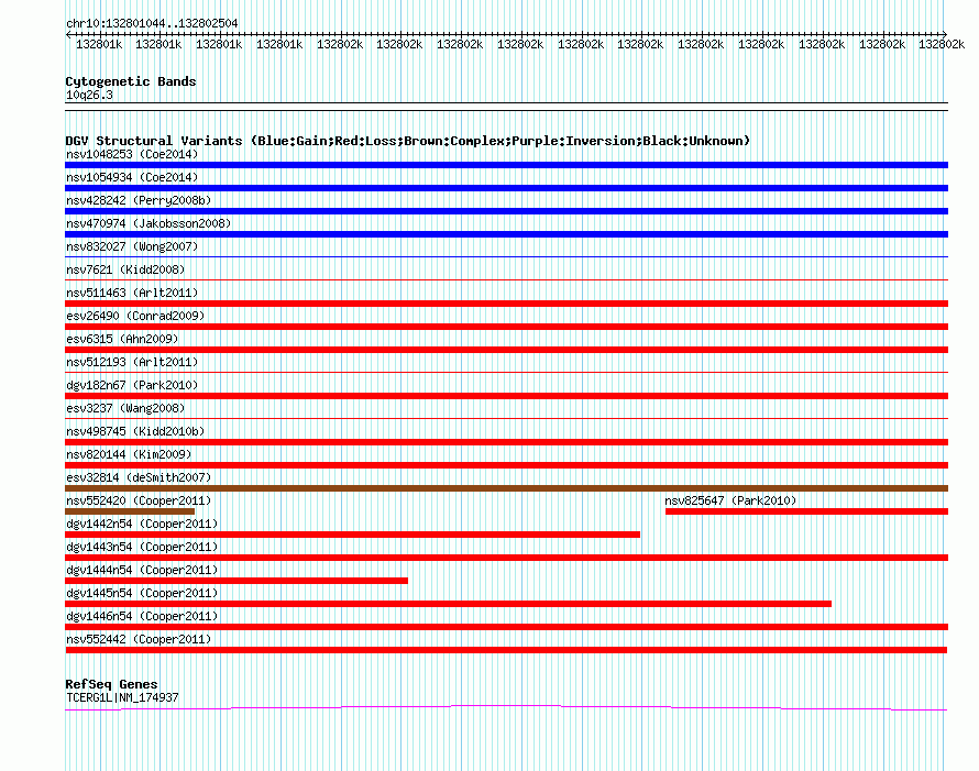 Variant DetailsVariant: nsv552442| Internal ID | 16339851 | | Landmark | | | Location Information | | | Cytoband | 10q26.3 | | Allele length | | Assembly | Allele length | | hg38 | 1461 | | hg19 | 1461 | | hg18 | 1461 |