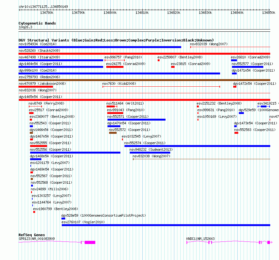 Variant DetailsVariant: nsv552541| Internal ID | 16339950 | | Landmark | | | Location Information | | | Cytoband | 10q26.3 | | Allele length | | Assembly | Allele length | | hg38 | 79025 | | hg19 | 79025 | | hg18 | 79025 |