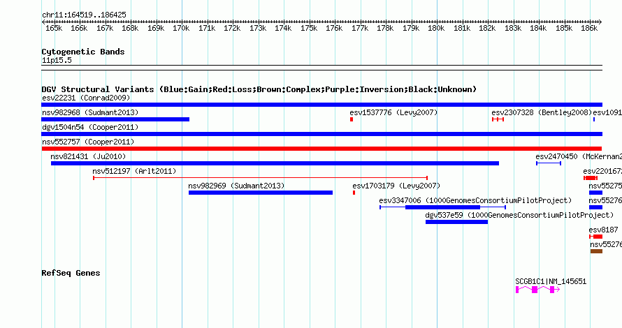 Variant DetailsVariant: nsv552757| Internal ID | 16340166 | | Landmark | | | Location Information | | | Cytoband | 11p15.5 | | Allele length | | Assembly | Allele length | | hg38 | 21907 | | hg19 | 21907 | | hg18 | 21907 |