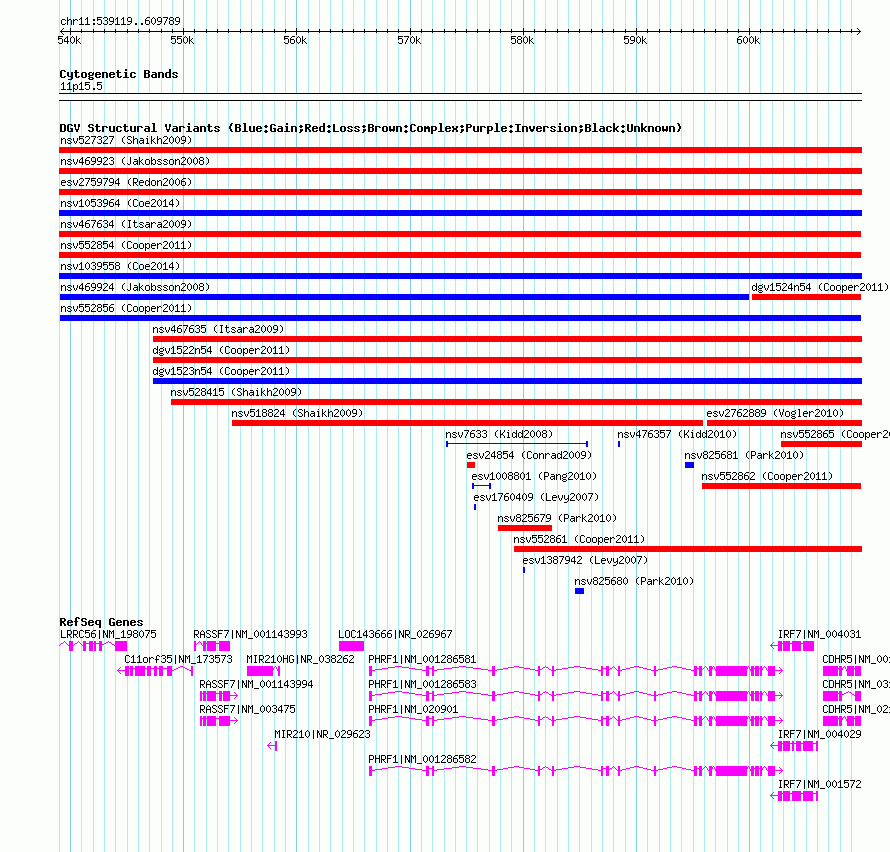 | Variant Type | CNV gain | Copy Number | | Allele State | | Allele Origin | | Probe Count | | Validation Flag | | Merged Status | M | Merged Variants | | Supporting Variants | nssv763552 | Samples | | Known Genes | C11orf35, CDHR5, IRF7, LOC143666, LRRC56, MIR210, MIR210HG, PHRF1, RASSF7 | Method | SNP array | Analysis | Illumina SNP array copy number analysis | Platform | Not reported | Comments | | Reference | Cooper_et_al_2011 | Pubmed ID | 21841781 | Accession Number(s) | nsv552856