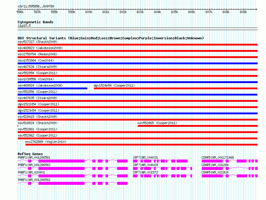 | Variant Type | CNV loss | Copy Number | | Allele State | | Allele Origin | | Probe Count | | Validation Flag | | Merged Status | M | Merged Variants | | Supporting Variants | nssv763557 | Samples | | Known Genes | CDHR5, IRF7, PHRF1 | Method | SNP array | Analysis | Illumina SNP array copy number analysis | Platform | Not reported | Comments | | Reference | Cooper_et_al_2011 | Pubmed ID | 21841781 | Accession Number(s) | nsv552862