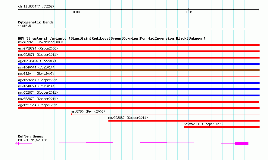 Variant DetailsVariant: nsv552883| Internal ID | 16340292 | | Landmark | | | Location Information | | | Cytoband | 11p15.5 | | Allele length | | Assembly | Allele length | | hg38 | 2151 | | hg19 | 2151 | | hg18 | 2151 |