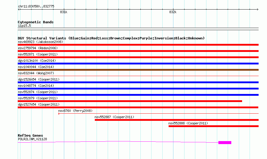 Variant DetailsVariant: nsv552885| Internal ID | 16340294 | | Landmark | | | Location Information | | | Cytoband | 11p15.5 | | Allele length | | Assembly | Allele length | | hg38 | 2196 | | hg19 | 2196 | | hg18 | 2196 |