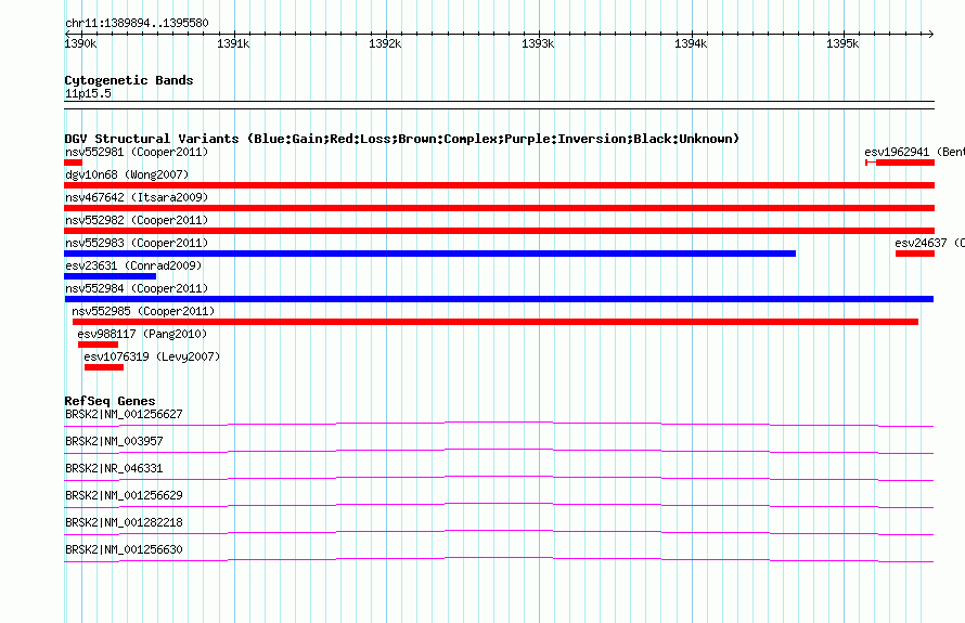 | Variant Type | CNV gain | Copy Number | | Allele State | | Allele Origin | | Probe Count | | Validation Flag | | Merged Status | M | Merged Variants | | Supporting Variants | nssv764280, nssv764279 | Samples | | Known Genes | BRSK2 | Method | SNP array | Analysis | Illumina SNP array copy number analysis | Platform | Not reported | Comments | | Reference | Cooper_et_al_2011 | Pubmed ID | 21841781 | Accession Number(s) | nsv552984