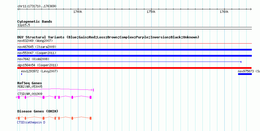 | | Variant Type | CNV loss | | Copy Number | | | Allele State | | | Allele Origin | | | Probe Count | | | Validation Flag | | | Merged Status | M | | Merged Variants | dgv1564n54 | | Supporting Variants | nssv764466 | | Samples | | | Known Genes | CTSD, MOB2 | | Method | SNP array | | Analysis | Illumina SNP array copy number analysis | | Platform | Not reported | | Comments | | | Reference | Cooper_et_al_2011 | | Pubmed ID | 21841781 | | Accession Number(s) | nsv553049