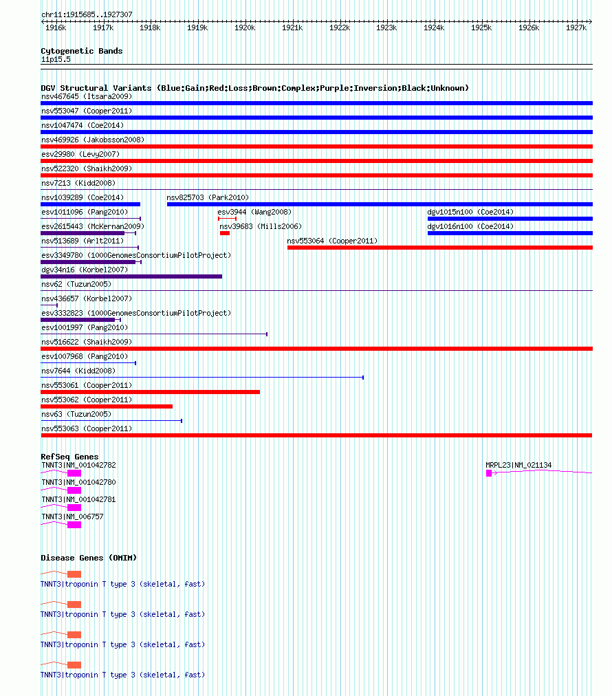 Variant DetailsVariant: nsv553063| Internal ID | 16340472 | | Landmark | | | Location Information | | | Cytoband | 11p15.5 | | Allele length | | Assembly | Allele length | | hg38 | 11623 | | hg19 | 11623 | | hg18 | 11623 |