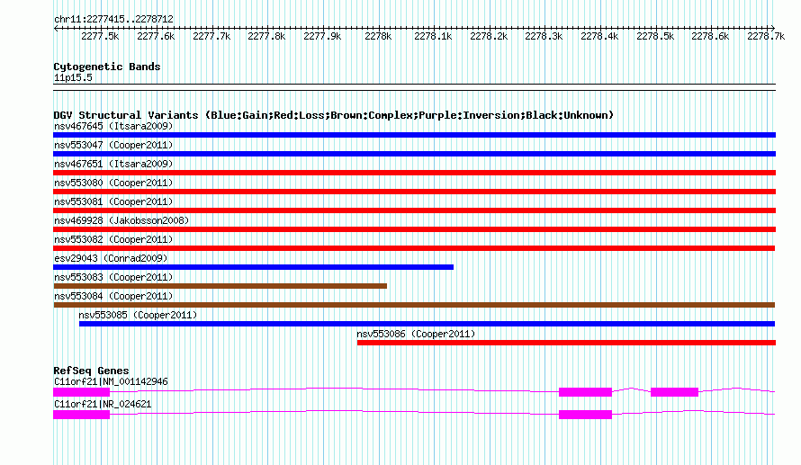 Variant DetailsVariant: nsv553084| Internal ID | 16340493 | | Landmark | | | Location Information | | | Cytoband | 11p15.5 | | Allele length | | Assembly | Allele length | | hg38 | 1298 | | hg19 | 1298 | | hg18 | 1298 |