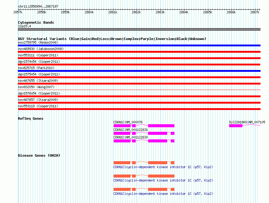 | Variant Type | CNV loss | Copy Number | | Allele State | | Allele Origin | | Probe Count | | Validation Flag | | Merged Status | M | Merged Variants | dgv1576n54 | Supporting Variants | nssv764547 | Samples | | Known Genes | CDKN1C, SLC22A18AS | Method | SNP array | Analysis | Illumina SNP array copy number analysis | Platform | Not reported | Comments | | Reference | Cooper_et_al_2011 | Pubmed ID | 21841781 | Accession Number(s) | nsv553118