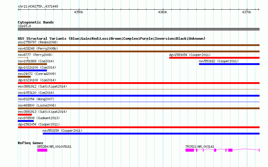 Variant DetailsVariant: nsv553156| Internal ID | 16340565 | | Landmark | | | Location Information | | | Cytoband | 11p15.4 | | Allele length | | Assembly | Allele length | | hg38 | 28691 | | hg19 | 28691 | | hg18 | 28691 |