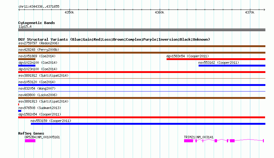 Variant DetailsVariant: nsv553158| Internal ID | 16340567 | | Landmark | | | Location Information | | | Cytoband | 11p15.4 | | Allele length | | Assembly | Allele length | | hg38 | 27320 | | hg19 | 27320 | | hg18 | 27320 |