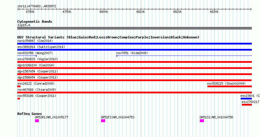 Variant DetailsVariant: nsv553187| Internal ID | 16340596 | | Landmark | | | Location Information | | | Cytoband | 11p15.4 | | Allele length | | Assembly | Allele length | | hg38 | 63490 | | hg19 | 63490 | | hg18 | 63490 |