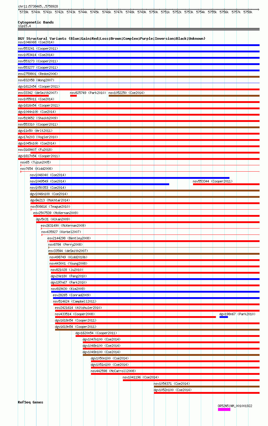 Variant DetailsVariant: nsv553312| Internal ID | 16340721 | | Landmark | | | Location Information | | | Cytoband | 11p15.4 | | Allele length | | Assembly | Allele length | | hg38 | 20464 | | hg19 | 20464 | | hg18 | 20464 |