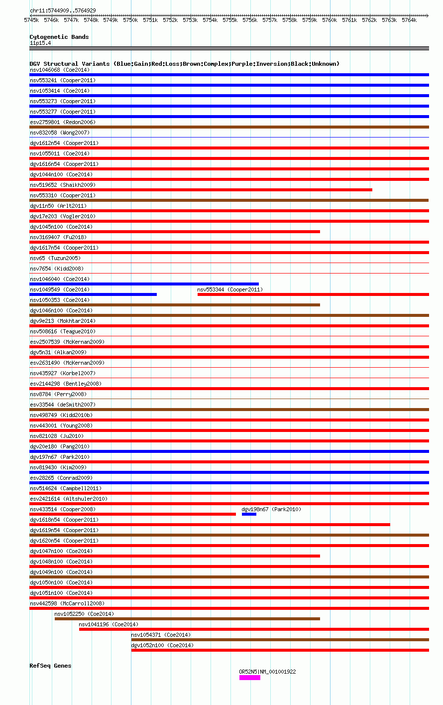 Variant DetailsVariant: nsv553334| Internal ID | 16340743 | | Landmark | | | Location Information | | | Cytoband | 11p15.4 | | Allele length | | Assembly | Allele length | | hg38 | 20021 | | hg19 | 20021 | | hg18 | 20021 |