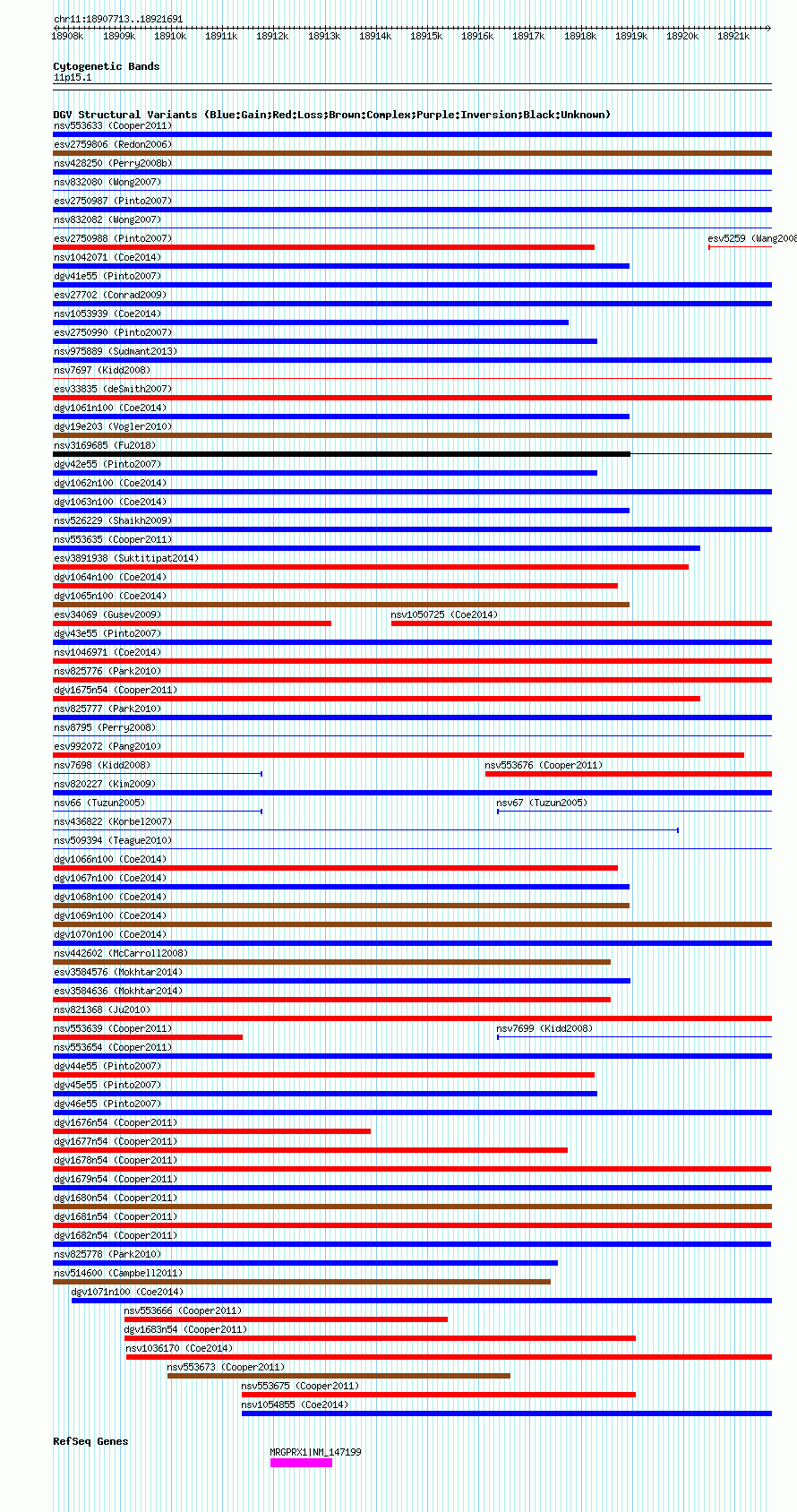 Variant DetailsVariant: nsv553663| Internal ID | 16341072 | | Landmark | | | Location Information | | | Cytoband | 11p15.1 | | Allele length | | Assembly | Allele length | | hg38 | 13979 | | hg19 | 13979 | | hg18 | 13979 |
