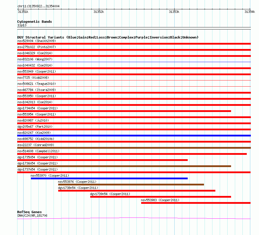 | | Variant Type | CNV loss | | Copy Number | | | Allele State | | | Allele Origin | | | Probe Count | | | Validation Flag | | | Merged Status | M | | Merged Variants | dgv1737n54 | | Supporting Variants | nssv770976, nssv770987, nssv771000, nssv770981, nssv770995, nssv770999, nssv770979, nssv771008, nssv771002, nssv770977, nssv770993, nssv770978, nssv770972, nssv770996, nssv771004, nssv771010, nssv771009, nssv770971, nssv770992, nssv770974, nssv771006, nssv770975, nssv771011, nssv771007, nssv771005, nssv770988, nssv770980, nssv770970, nssv771003, nssv770990, nssv770986, nssv770991, nssv770998, nssv771001, nssv770983, nssv770984, nssv770985, nssv770994, nssv770982, nssv770973, nssv770997, nssv770989 | | Samples | | | Known Genes | DNAJC24 | | Method | SNP array | | Analysis | Illumina SNP array copy number analysis | | Platform | Not reported | | Comments | | | Reference | Cooper_et_al_2011 | | Pubmed ID | 21841781 | | Accession Number(s) | nsv553968