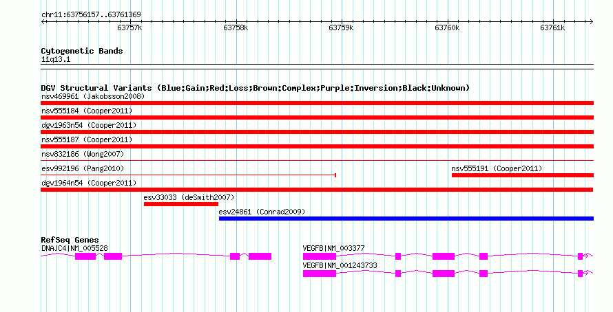 | | Variant Type | CNV loss | | Copy Number | | | Allele State | | | Allele Origin | | | Probe Count | | | Validation Flag | | | Merged Status | M | | Merged Variants | dgv1964n54 | | Supporting Variants | nssv777151, nssv777152 | | Samples | | | Known Genes | DNAJC4, VEGFB | | Method | SNP array | | Analysis | Illumina SNP array copy number analysis | | Platform | Not reported | | Comments | | | Reference | Cooper_et_al_2011 | | Pubmed ID | 21841781 | | Accession Number(s) | nsv555189