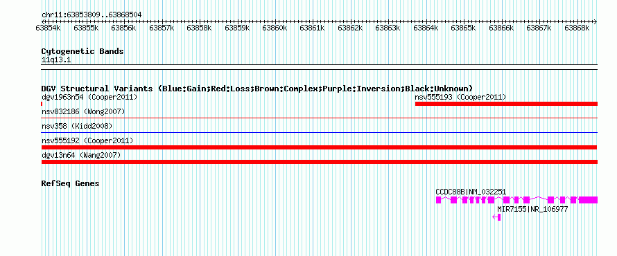 | | Variant Type | CNV loss | | Copy Number | | | Allele State | | | Allele Origin | | | Probe Count | | | Validation Flag | | | Merged Status | M | | Merged Variants | | | Supporting Variants | nssv777156 | | Samples | | | Known Genes | CCDC88B, MIR7155 | | Method | SNP array | | Analysis | Illumina SNP array copy number analysis | | Platform | Not reported | | Comments | | | Reference | Cooper_et_al_2011 | | Pubmed ID | 21841781 | | Accession Number(s) | nsv555192