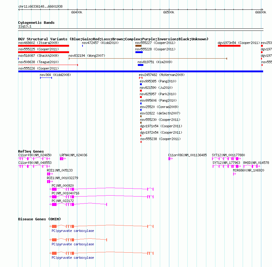 | Variant Type | CNV gain | Copy Number | | Allele State | | Allele Origin | | Probe Count | | Validation Flag | | Merged Status | M | Merged Variants | | Supporting Variants | nssv778085 | Samples | | Known Genes | C11orf80, C11orf86, LRFN4, MIR6860, PC, RCE1, RHOD, SYT12 | Method | SNP array | Analysis | Illumina SNP array copy number analysis | Platform | Not reported | Comments | | Reference | Cooper_et_al_2011 | Pubmed ID | 21841781 | Accession Number(s) | nsv555226