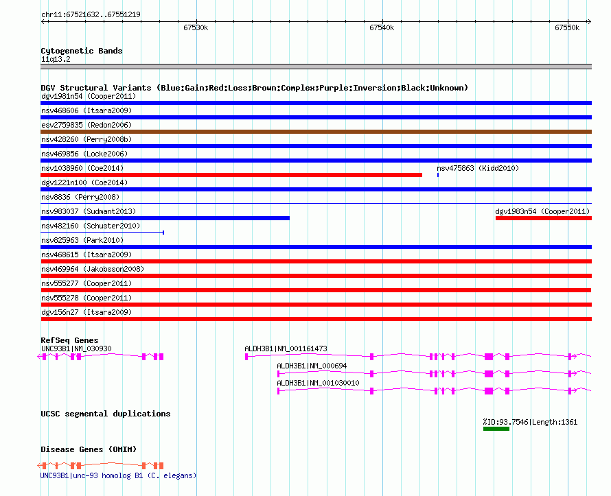 Variant DetailsVariant: nsv555277| Internal ID | 15996000 | | Landmark | | | Location Information | | | Cytoband | 11q13.2 | | Allele length | | Assembly | Allele length | | hg38 | 29591 | | hg19 | 29588 | | hg18 | 29588 |