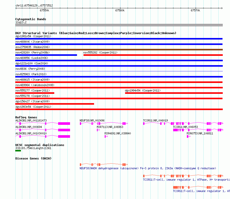 Variant DetailsVariant: nsv555279| Internal ID | 15996002 | | Landmark | | | Location Information | | | Cytoband | 11q13.2 | | Allele length | | Assembly | Allele length | | hg38 | 27385 | | hg19 | 27384 | | hg18 | 27384 |