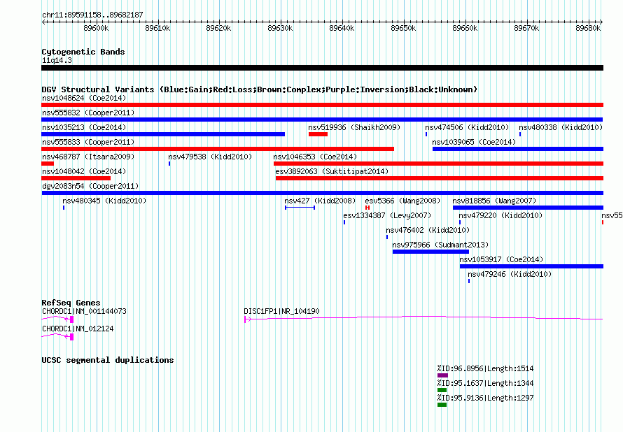 | Variant Type | CNV gain | Copy Number | | Allele State | | Allele Origin | | Probe Count | | Validation Flag | | Merged Status | M | Merged Variants | dgv2083n54 | Supporting Variants | nssv780546 | Samples | | Known Genes | CHORDC1, DISC1FP1 | Method | SNP array | Analysis | Illumina SNP array copy number analysis | Platform | Not reported | Comments | | Reference | Cooper_et_al_2011 | Pubmed ID | 21841781 | Accession Number(s) | nsv555834