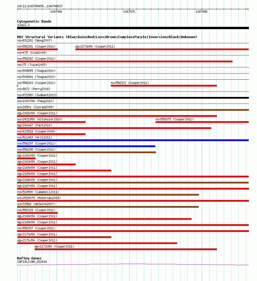 Variant DetailsVariant: nsv556349| Internal ID | 16343758 | | Landmark | | | Location Information | | | Cytoband | 11q22.3 | | Allele length | | Assembly | Allele length | | hg38 | 3179 | | hg19 | 3179 | | hg18 | 3179 |